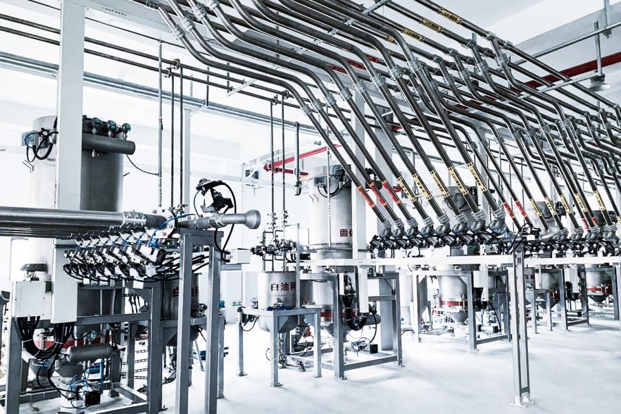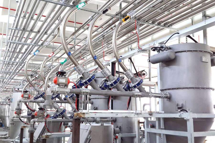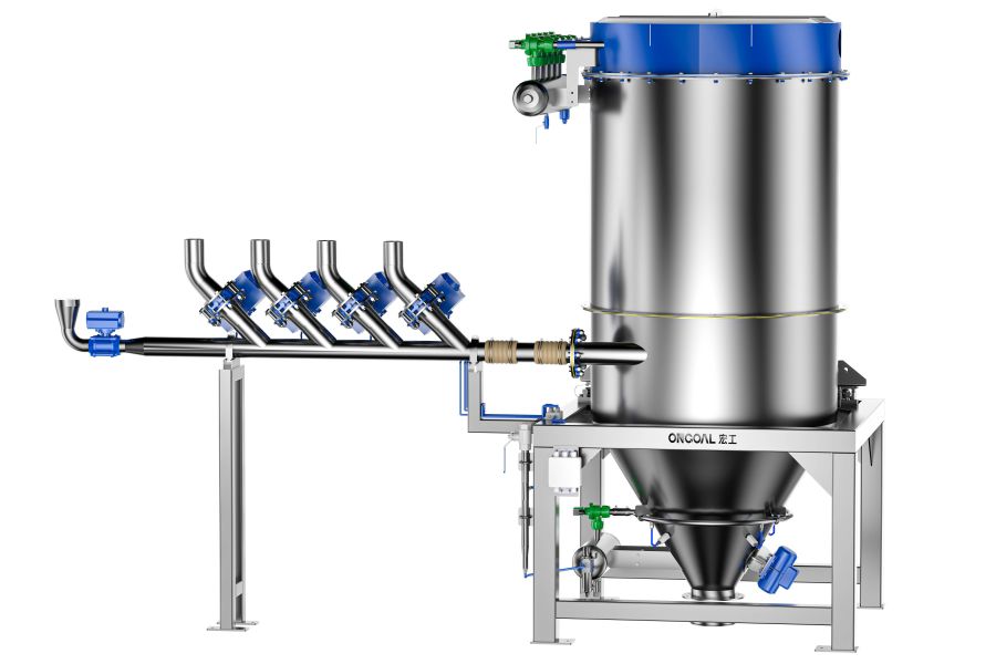 可對接多個料倉進行配料計量,標準配置5/8個進料口,最多能給24種不同粉粒料配料。