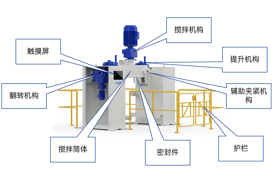 混合機提升組件由絲杠升降機和提升爪構(gòu)成,用萬向接頭連接,避免提升過程中卡死,限位板固定行動軌跡,上法蘭自動對位,相比于直上直下有了緩和功能。